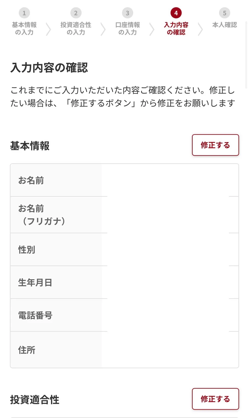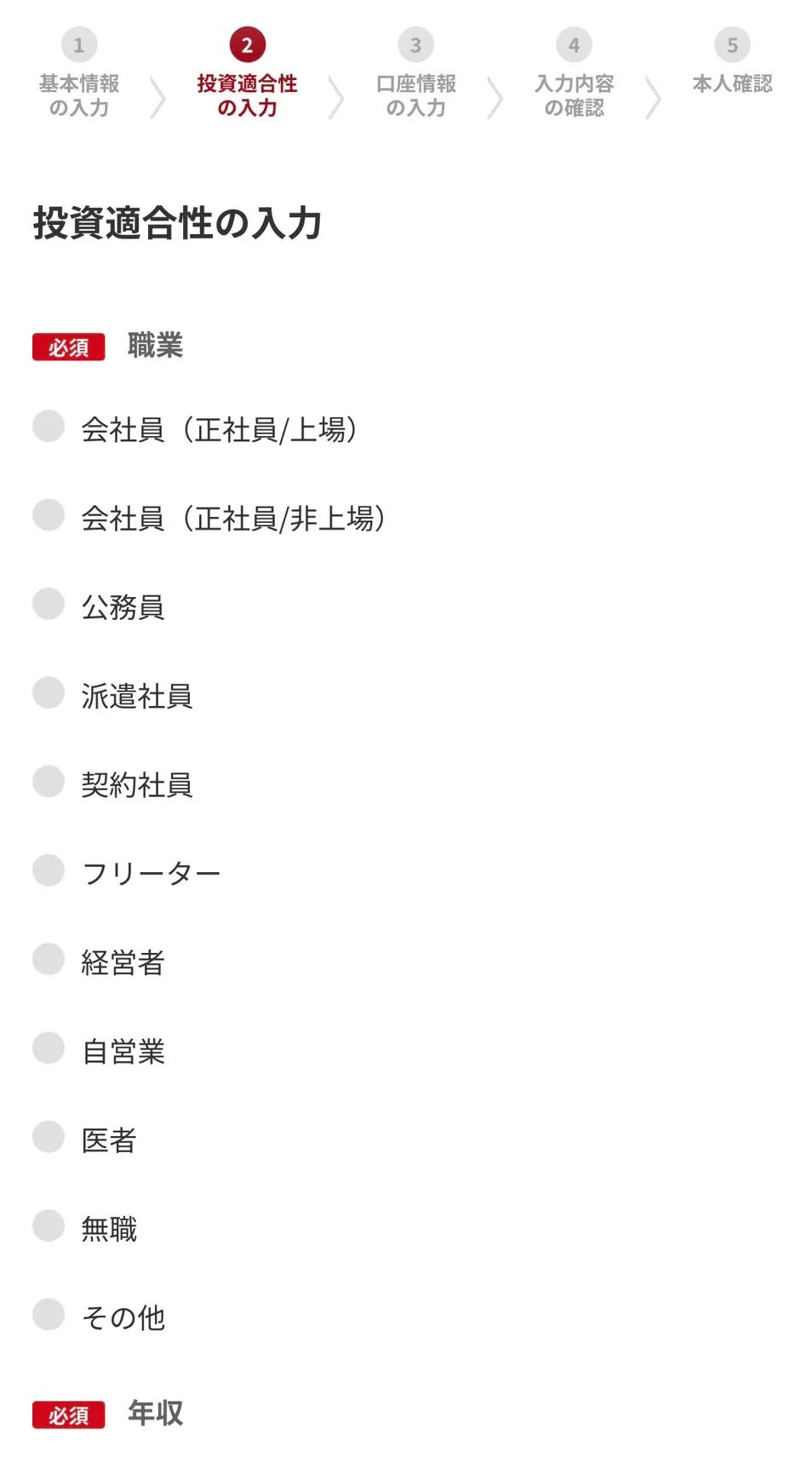 続いて、職業や年収など投資適合性についての項目を答えていきます。