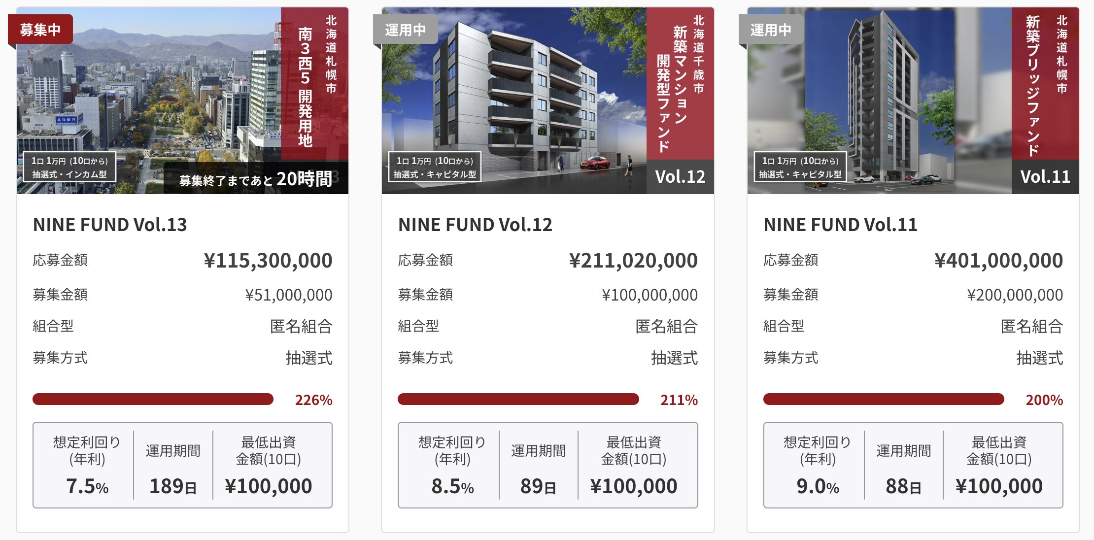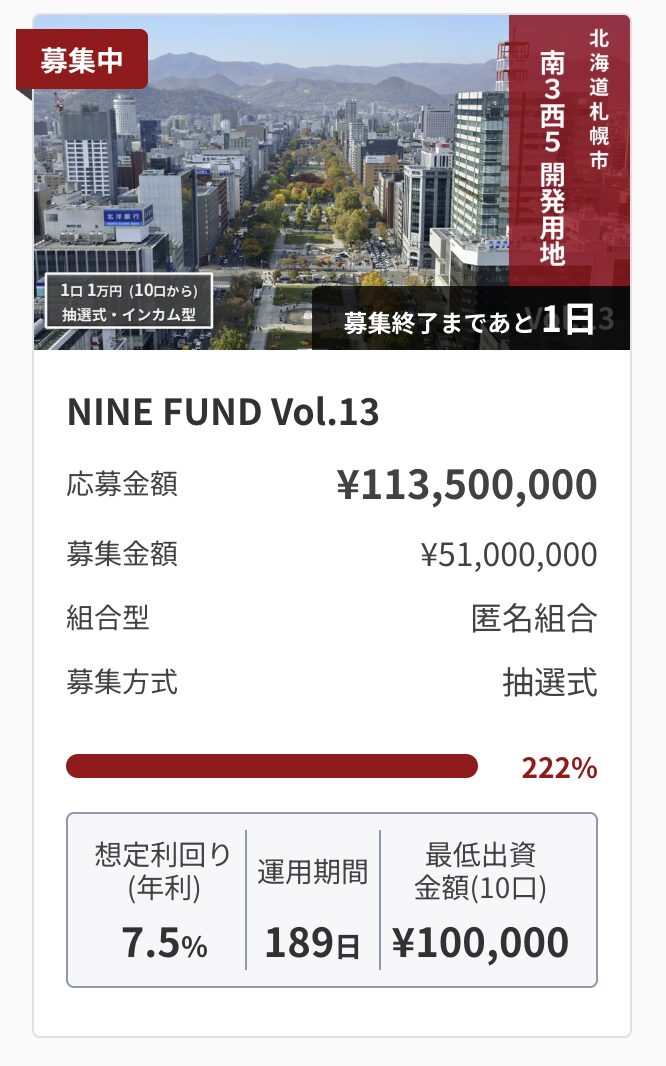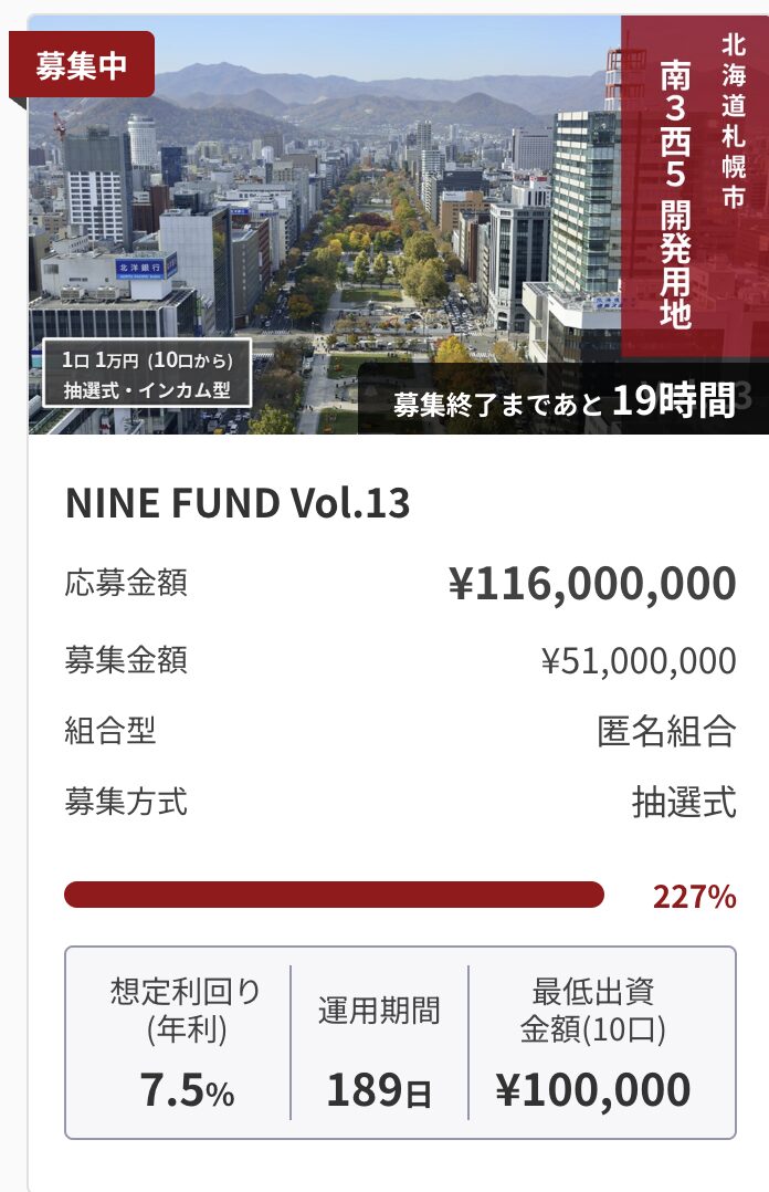NINE FUND(ナインファンド)は、全て抽選方式で倍率は毎回2倍以上、9倍を超えたこともありました。人気ですね。