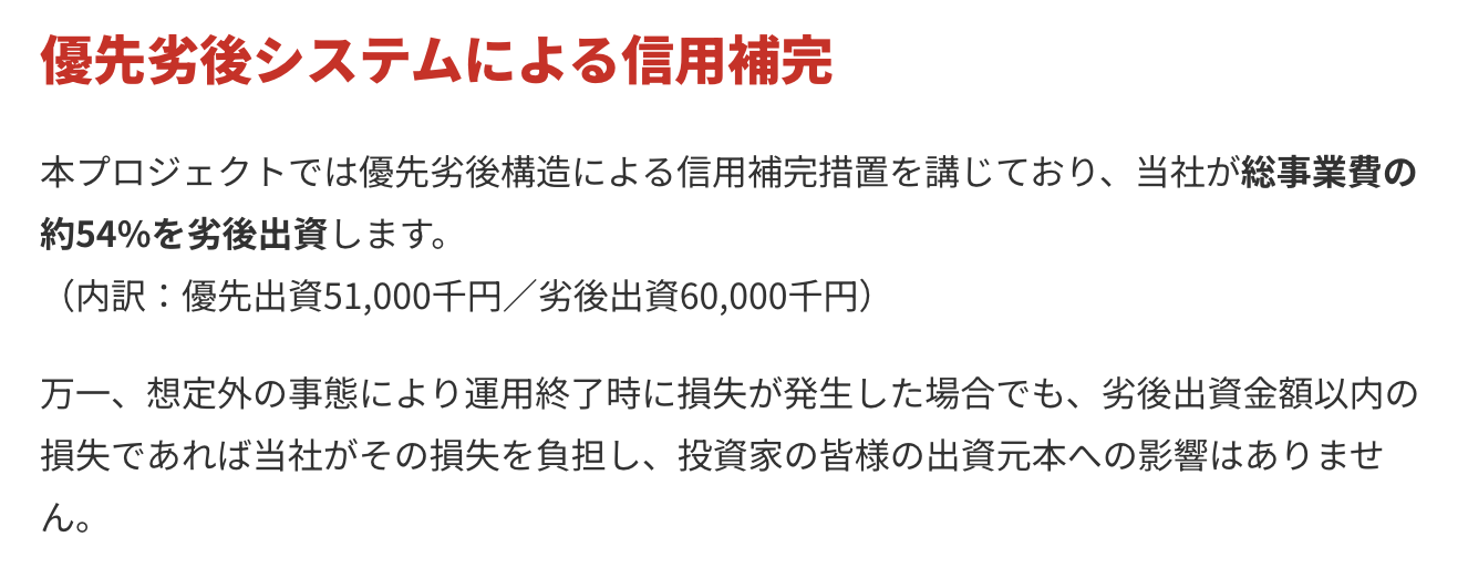 これについては『劣後出資割合が高い』の箇所で詳しく解説します。