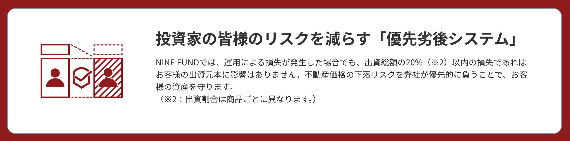 NINE FUND(ナインファンド)では「優先劣後出資」という仕組みが採用されており、運営会社が先に損失を負担する仕組みになっています。