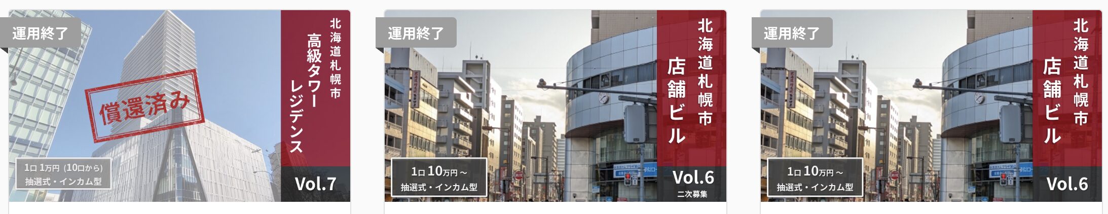 | メリット | ・利回りが高い ・安定した家賃収入が見込める ・3〜6ヶ月の短期運用 ・劣後出資の割合が高い ・収益性の高い北海道札幌に特化 |