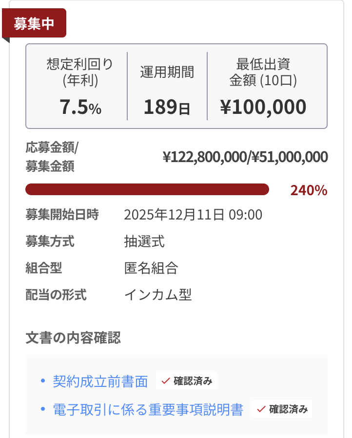 実際に私が応募したVol.13ファンドでは、利回り7.5%、劣後出資54%と非常に魅力的な条件が揃っていました。