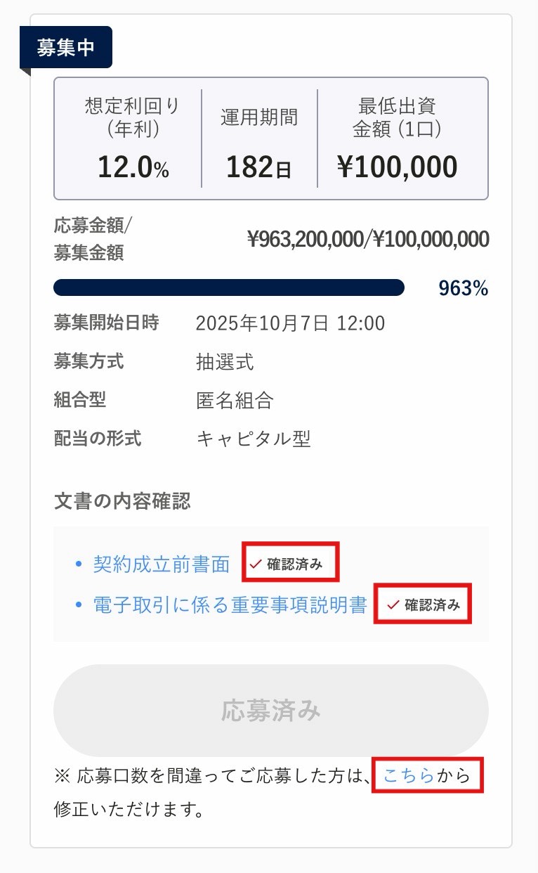 応募した後に口数を修正したい場合は、「応募済み」ボタン下部の「こちらから」の箇所から変更できます。