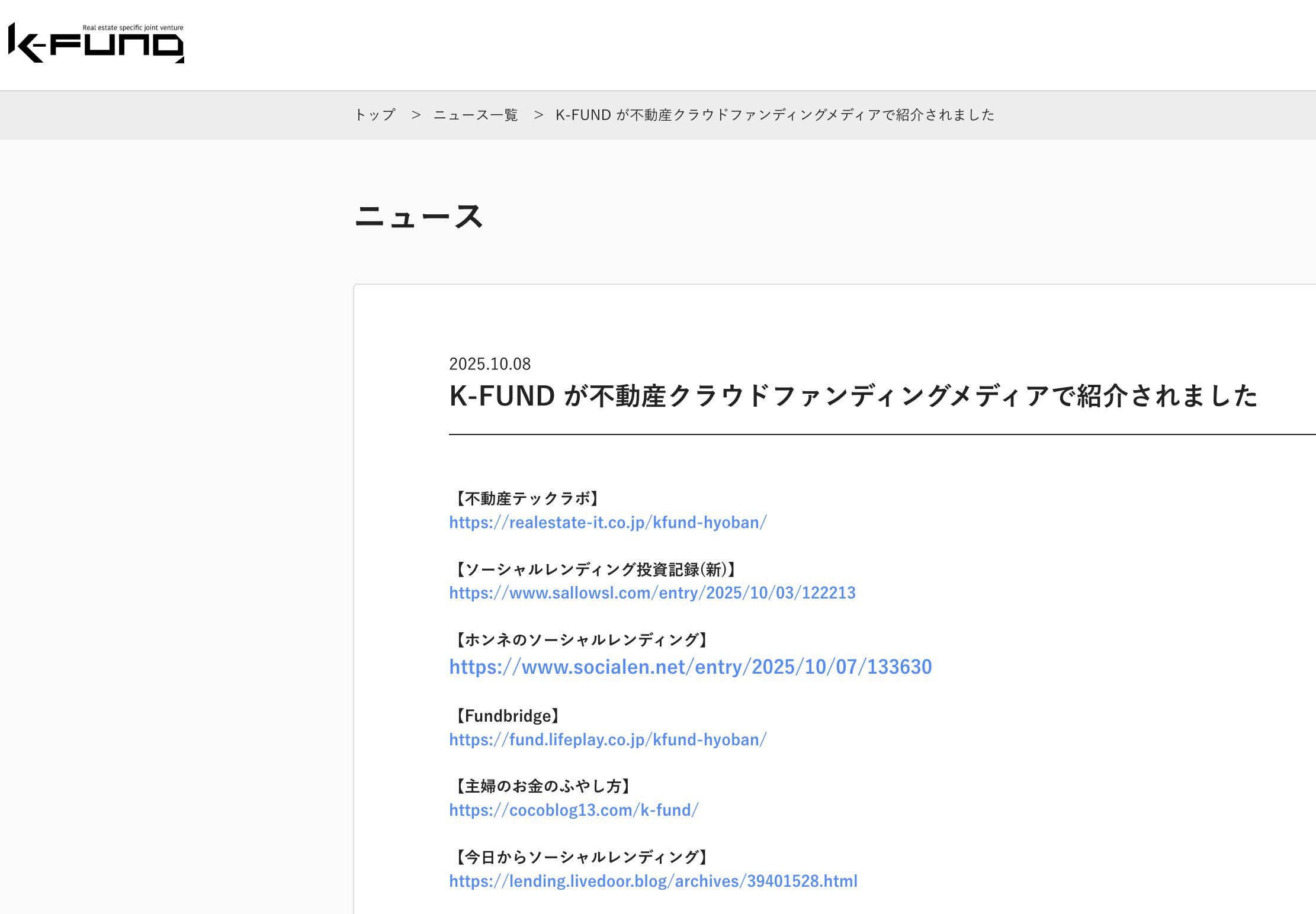 不動産クラウドファンディングサービスのK-FUND公式サイトにて当ブログの記事が紹介されました。